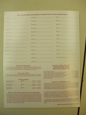 back of the folder. The date for each Thursday of the year, along with a line for a parent signature,